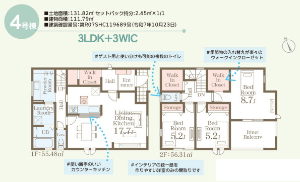 | 建物面積/坪数 | 110.96㎡ / 33.56坪 | 土地面積/坪数 | 131.82㎡ / 39.87坪 |
