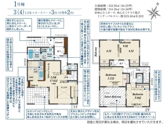 | 建物面積/坪数 | 114.26㎡ / 34.56坪 | 土地面積/坪数 | 152.92㎡ / 46.25坪 |