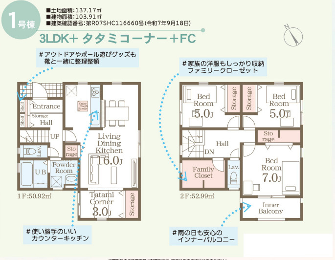 | 建物面積/坪数 | 103.91㎡ / 31.43坪 | 土地面積/坪数 | 137.17㎡ / 41.49坪 |